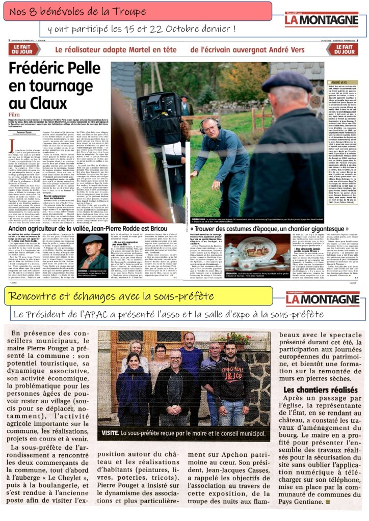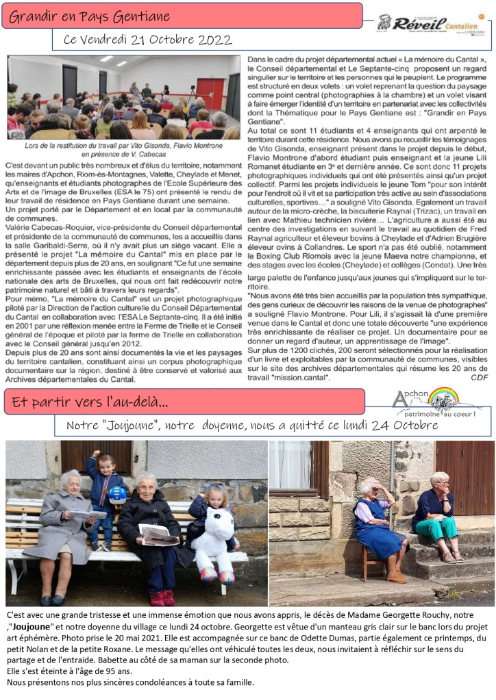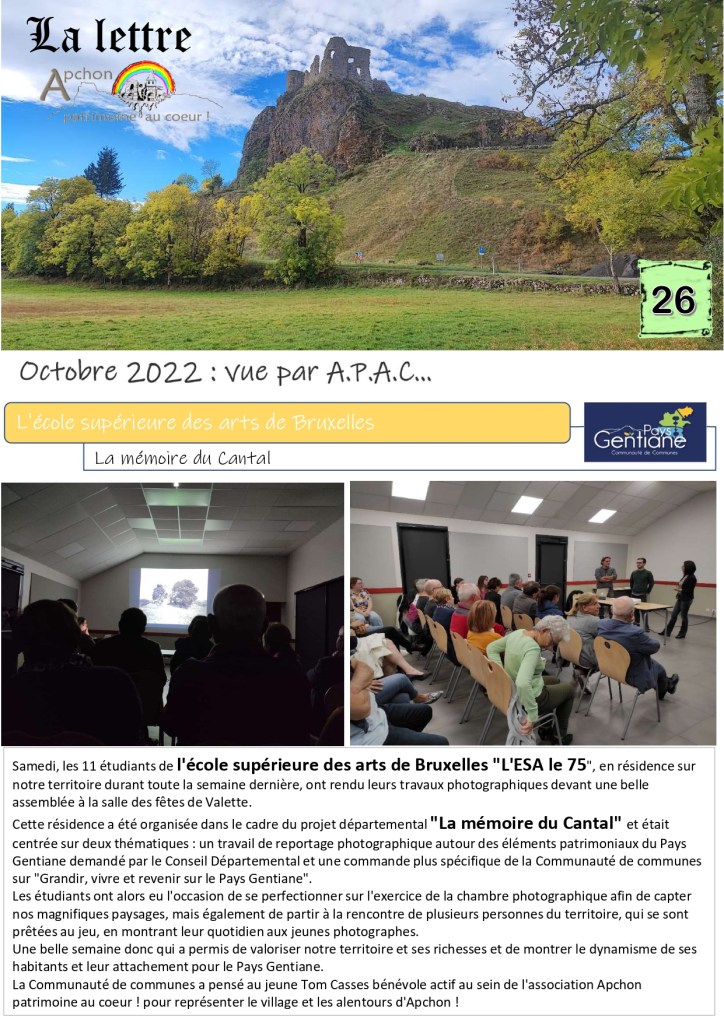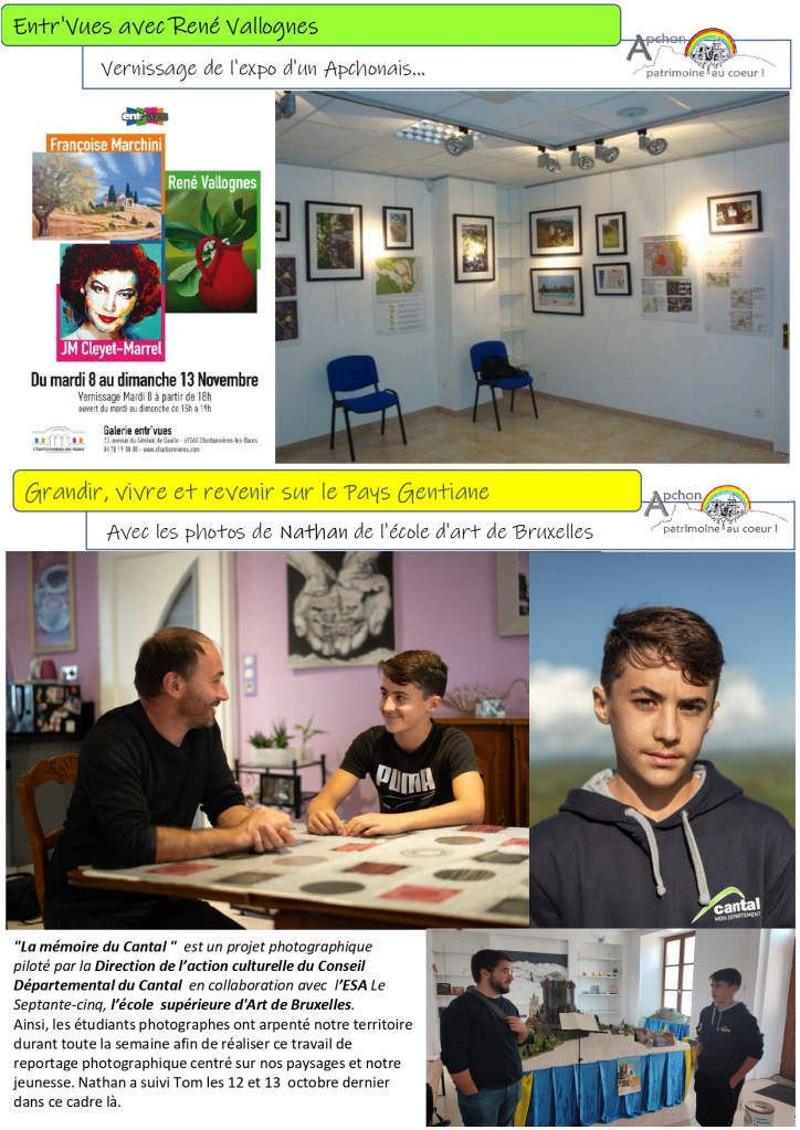 Ecole supérieure des arts de Bruxelles « l’ESA le 75 » – La mémoire du Cantal – CASSES Tom – VALLOGNES René – Exposition – Peintre – Martel en tête – Film – Acteur – Sous-préfète – ROUCHY Georgette « Joujoune » – Visitez Apchon récompensé – Prix impact social – Concours du Geste d’Or