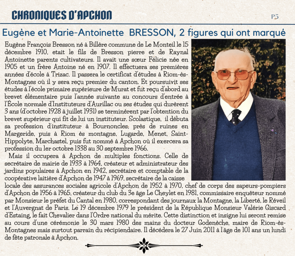 Eugène François Bresson né à Billère commune de Le Monteil le 15 décembre 1910, etait le fils de Bresson pierre et de Raynal Antoinette parents cultivateurs. Il avait une sœur Félicie née en 1905 et un frère Antoine né en 1907. Il effectuera ses premières années d’école à Trizac. Il passera le certificat d’études à Riom-ès-Montagnes où il y sera reçu premier du canton. Et poursuivit ses études à l’école primaire supérieure de Murat et fut reçu d’abord au brevet élémentaire puis l’année suivante au concours d’entrée à l’École normale d’Instituteurs d’Aurillac ou ses études qui durèrent 3 ans (d’octobre 1928 à juillet 1931) se terminèrent par l’obtention du brevet supérieur qui fit de lui un instituteur. Scolastique, il débuta sa profession d’instituteur à Bournoncles, près de ruines en Margeride, puis à Riom ès montagne, Lugarde, Menet, Saint-Hippolyte, Marchastel, puis fut nommé à Apchon où il exercera sa profession du 1er octobre 1338 au 30 septembre 1966.