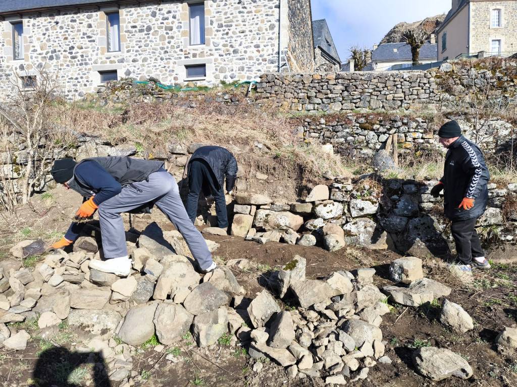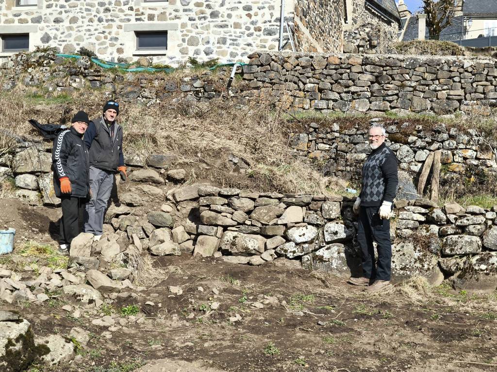 Remonter un mur, récupérer croûtes de bois à la scierie, préparation implantation poteaux pour accueillir la planche ou figure le nom du jardin,